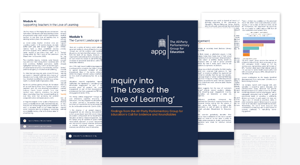 I have recently had the privilege of being involved in the All-Party Parliamentary Group (APPG) for Education on The Loss of the Love of Learning. This has involved attending a round table event in a call for evidence; working alongside other teachers, pupils and educational professionals who have a passion for bringing back a love of teaching and learning in and out of the classroom.