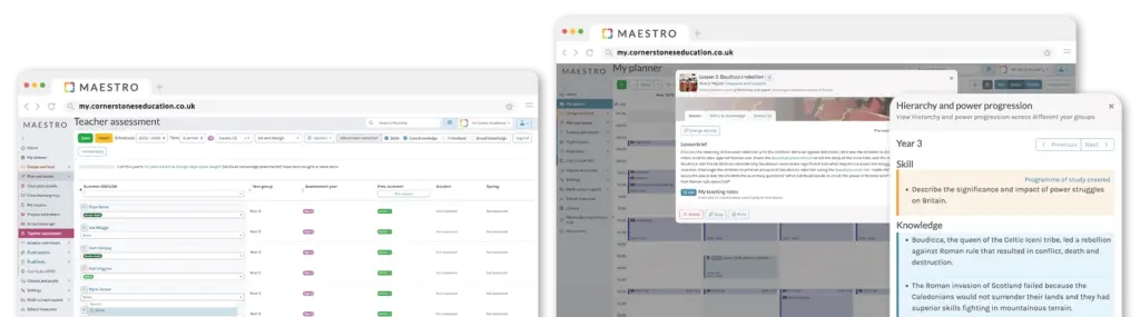 Fully integrated assessment sits at the heart of the system, underpinned by the Cornerstones comprehensive skills and knowledge progression framework, which spans Nursery to Year 6. With live, editable planning, seamless MIS integration and powerful reporting tools, Maestro saves hours while providing the insight primary schools need to drive meaningful learning. Backed by expert personal online 1:1 support, we work in partnership with schools to ensure their curriculum is purposeful, impactful and ready for inspection by meeting the requirements of Ofsted, Estyn, ETI or other inspections.