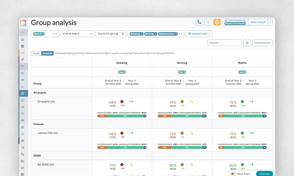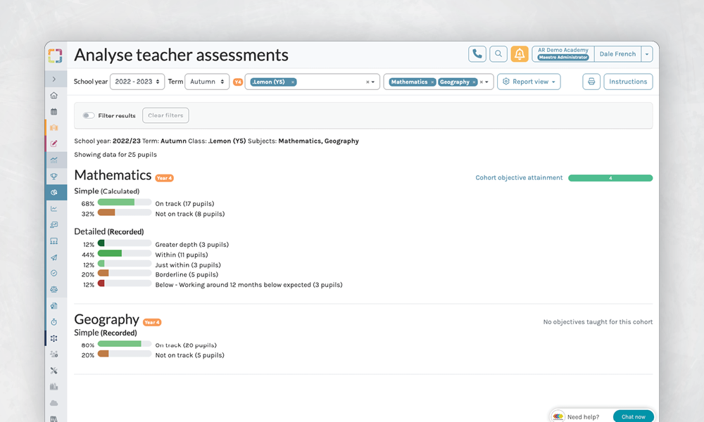 View the teacher assessments for single or multiple year groups, classes or learning groups, and drill down into the actual judgements for each pupil or pupil group.