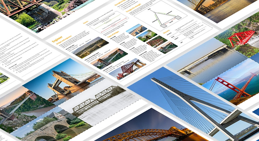 This project teaches children about remarkable engineers and significant bridges, learning to identify features, such as beams, arches and trusses. They complete a bridge-building engineering challenge to create a bridge prototype.