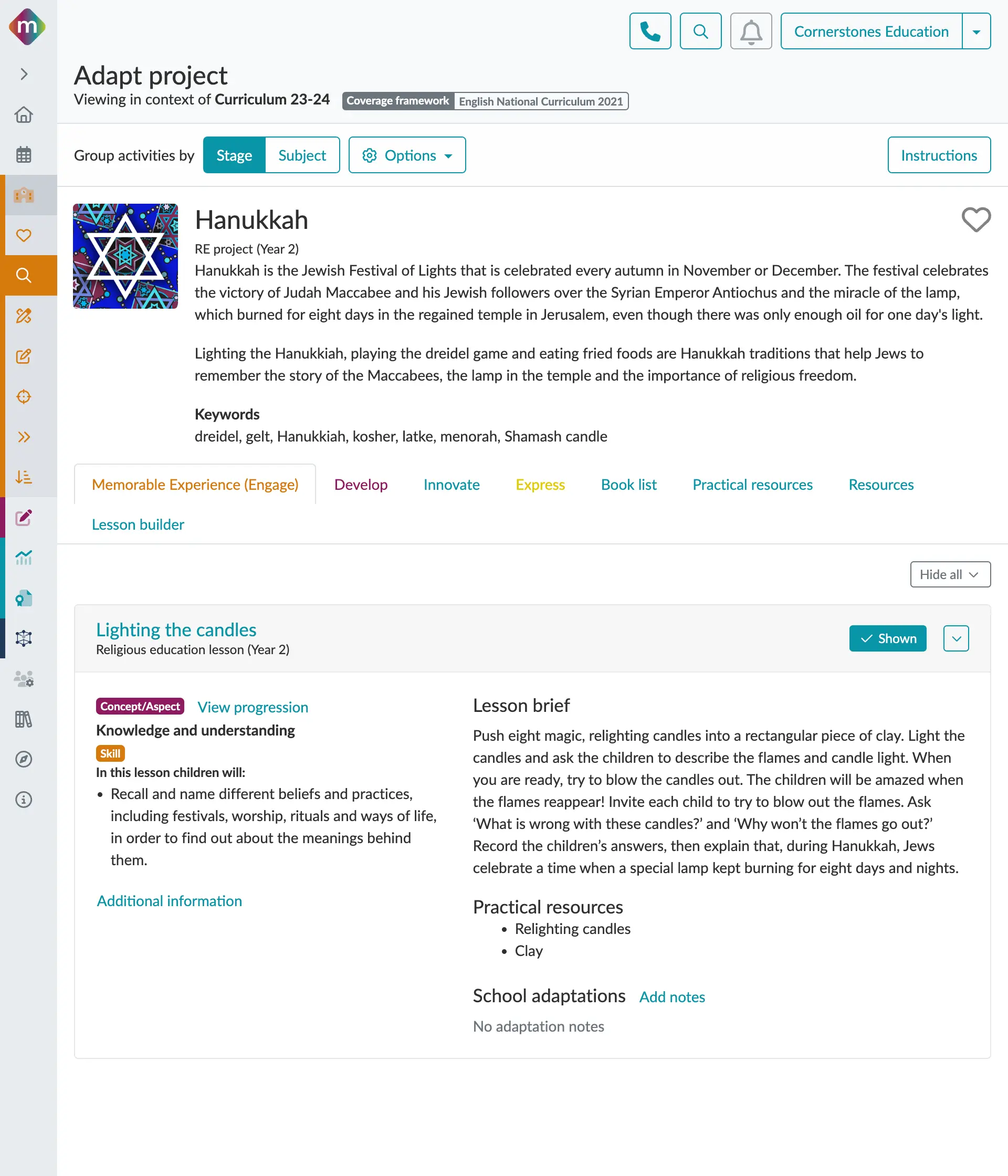 This project teaches children about Hanukkah, the Jewish Festival of Lights that is celebrated every autumn in November or December. The festival celebrates the victory of Judah Maccabee and his Jewish followers over the Syrian Emperor Antiochus and the miracle of the lamp, which burned for eight days in the regained temple in Jerusalem, even though there was only enough oil for one day’s light.