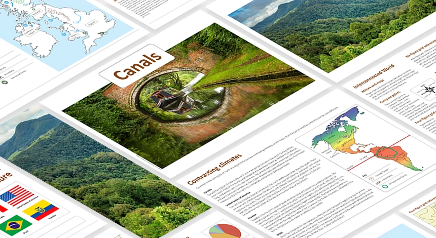 This project teaches children about compass points and four and six-figure grid references. They learn about the tropics and the countries, climates and culture of North and South America. Children identify physical features in the United Kingdom and learn about the National Rail and canal networks. They conduct an enquiry to prove a hypothesis, gathering data from maps and surveys before drawing conclusions.